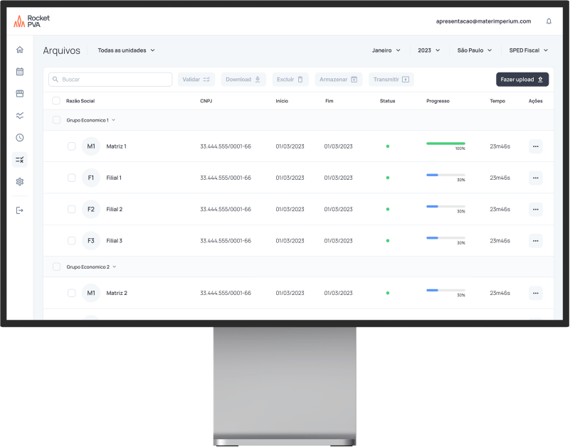 Com o RocketPVA, você valida e transmite simultaneamente vários arquivos do SPED Fiscal, Contribuições e Contábil, processando cada um até 15 vezes mais rápido — e agora também pode exportá-los para Excel, editar com facilidade e reconverter automaticamente para o layout oficial .TXT SPED